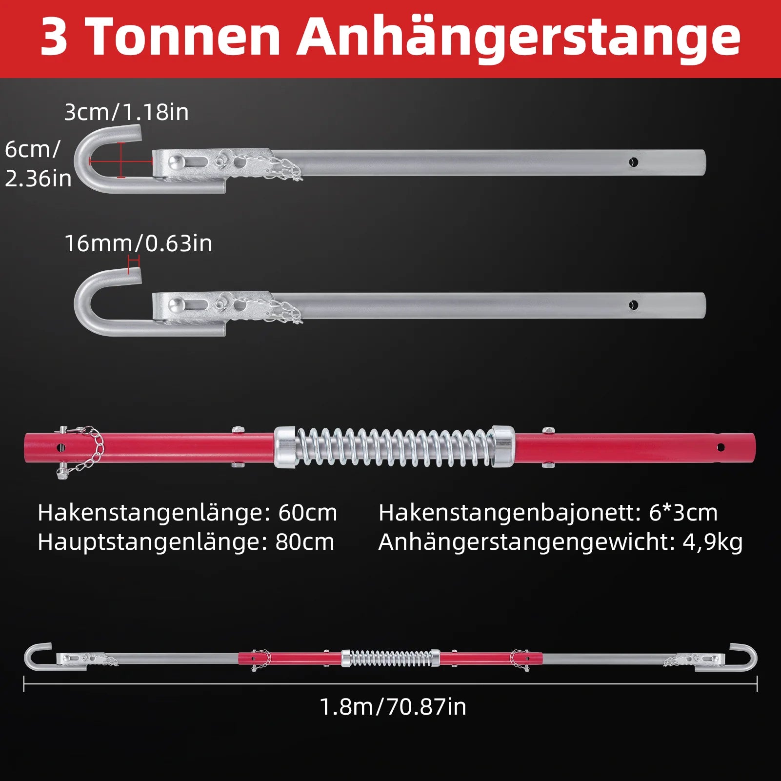 Spécifications techniques : cette barre de remorquage est fabriquée en acier durable.Il a une capacité de charge maximale de 3 000 kg.La longueur totale est d'environ 1 800 mm une fois assemblé et environ 900 mm une fois stocké.Livré avec des instructions complètes et un sac de rangement gratuit.