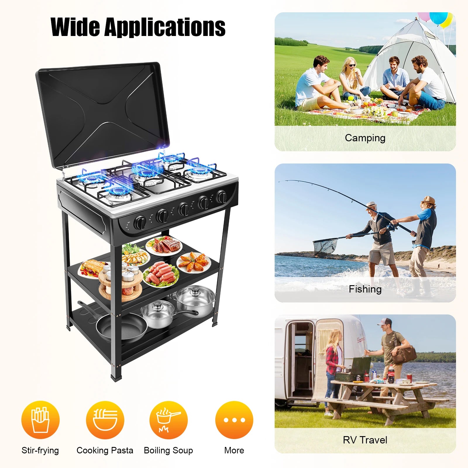 Ce naturelgazLe poêle à 5 brûleurs convient pour sauter, cuire des pâtes, faire bouillir de la soupe, etc., et convient aux activités de plein air telles que le camping, la pêche, les voyages en camping-car et la préparation aux situations d'urgence.