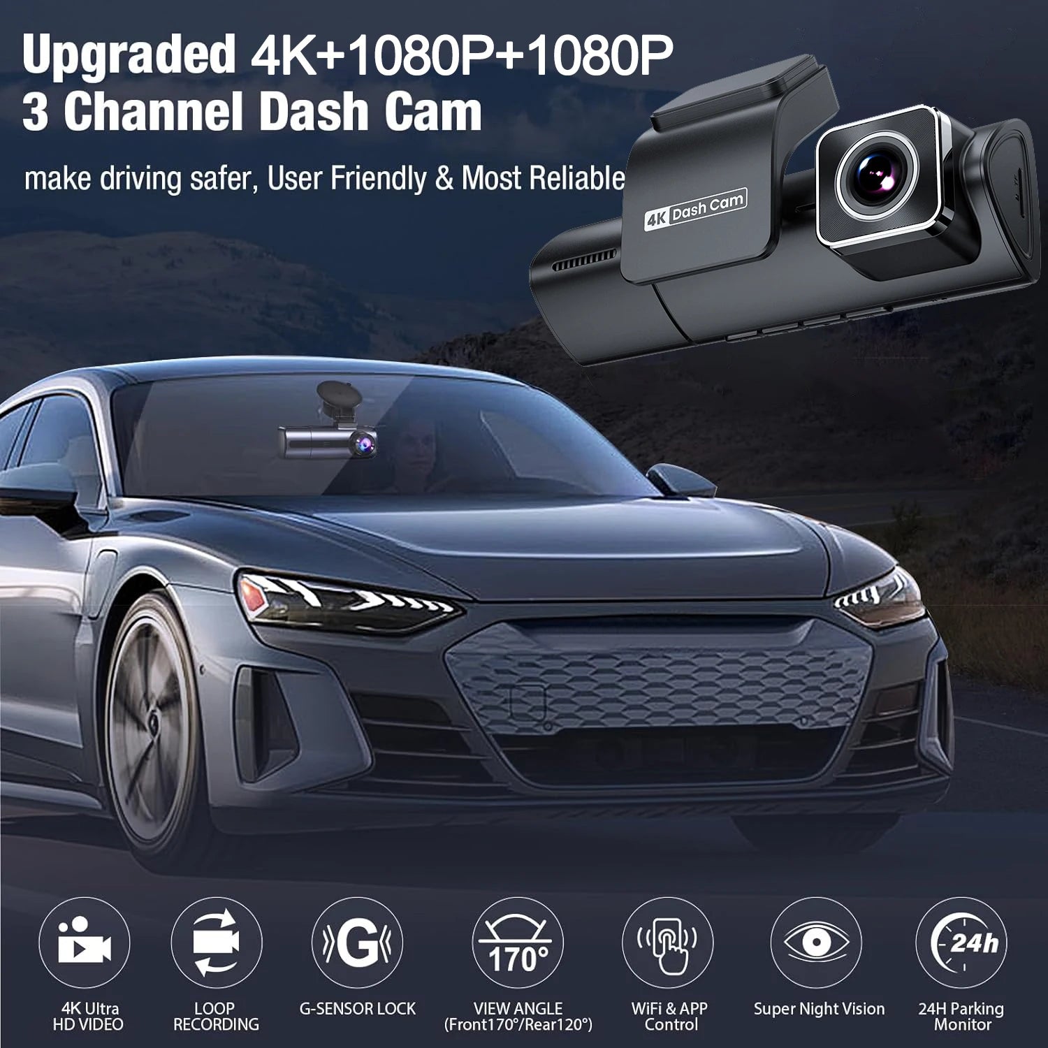 Caméra de tableau de bord Triple 4K, GPS, avant, intérieure et arrière, WiFi, 3CH, pour voiture, avec contrôle par application, Vision nocturne, Mode stationnement 24H, enregistrement en boucle