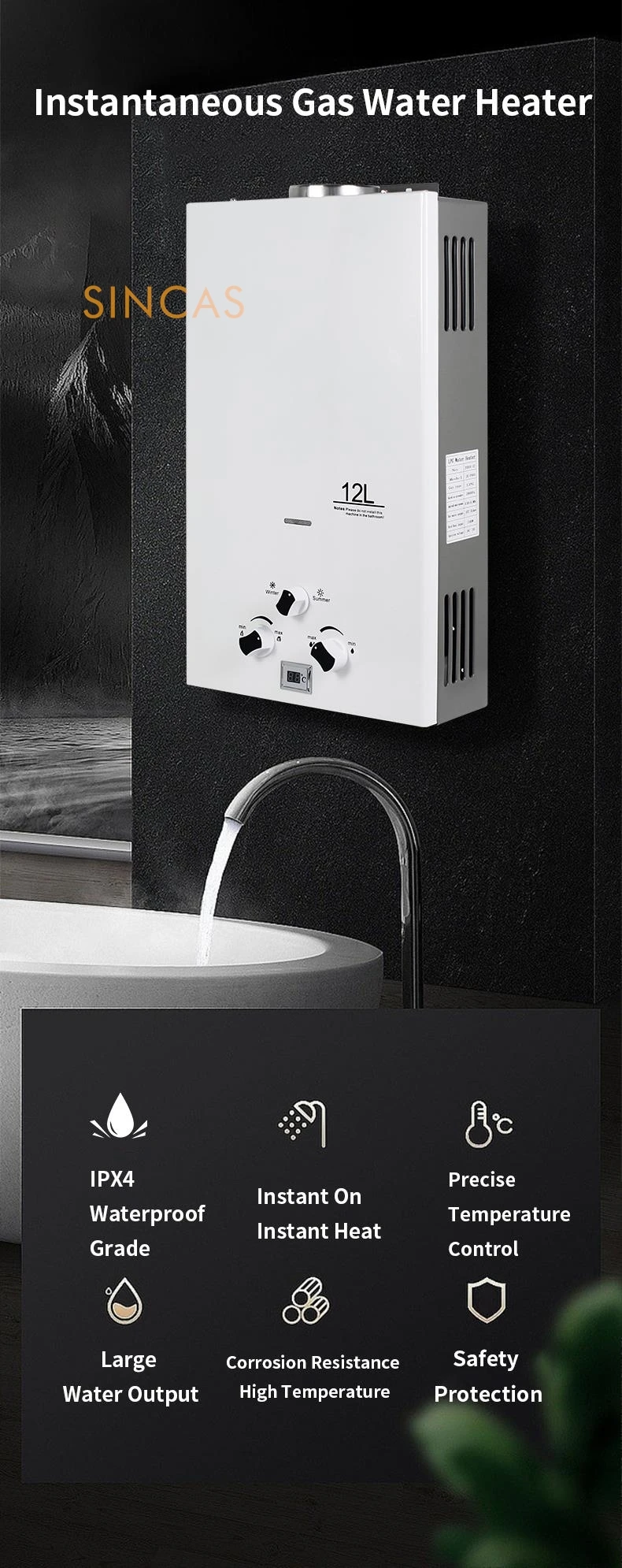 4. Protection contre la chaleur: le chauffe-eau s'éteint automatiquement lorsque la température de l'eau est supérieure à 77 ° C, et il redémarre plus tard lorsque l'eau devient plus fraîche.