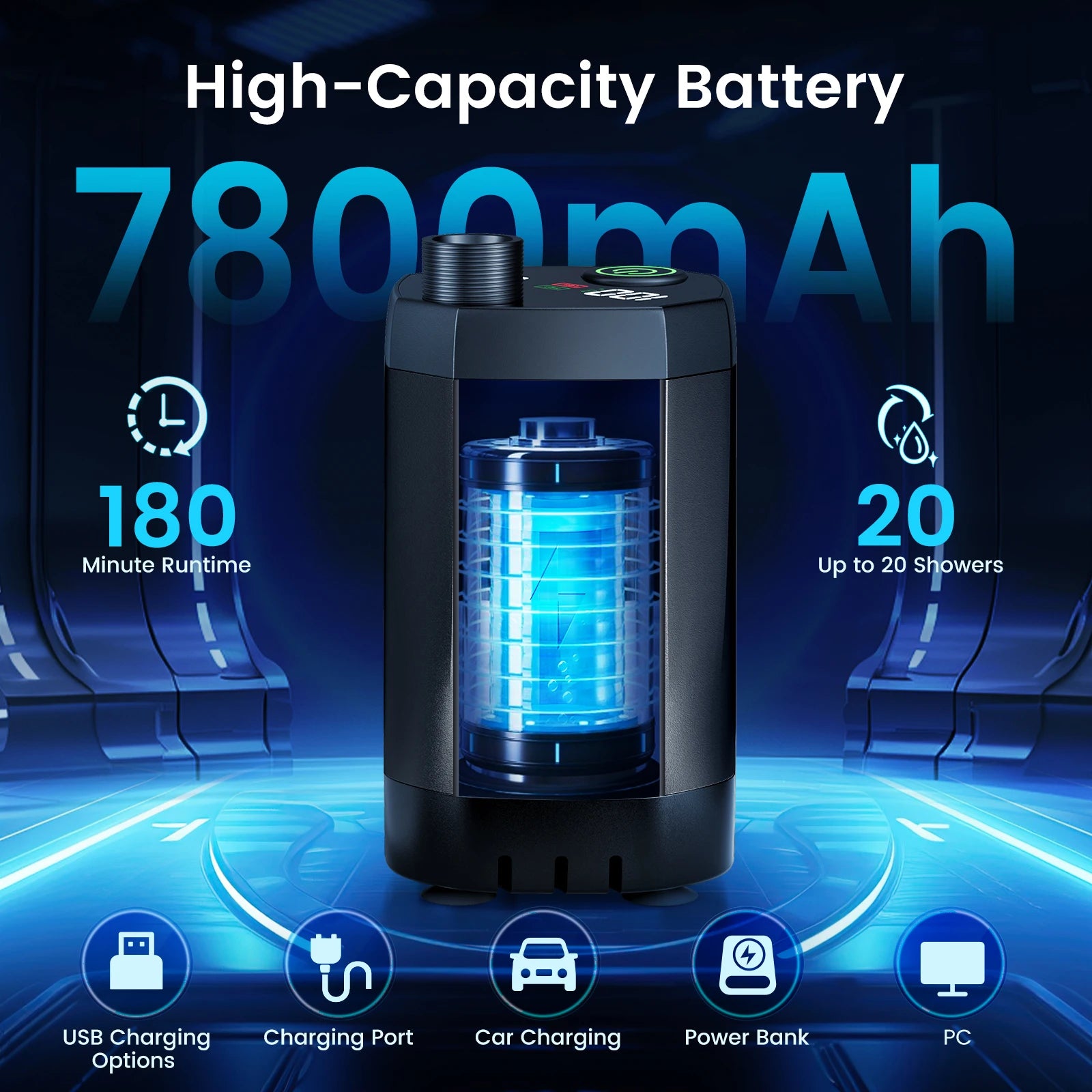 Pompe de douche rechargeable longue durée :Équipée d'une batterie de 7 800 mAh, notre douche de camping portable offre un débit d'eau constant pouvant aller jusqu'à 120 à 180 minutes d'utilisation continue.Avec un bouton en continu pour un contrôle précis de l'eau et une vanne d'arrêt intégrée, vous pouvez facilement régler le débit selon vos préférences tout en économisant de l'eau.