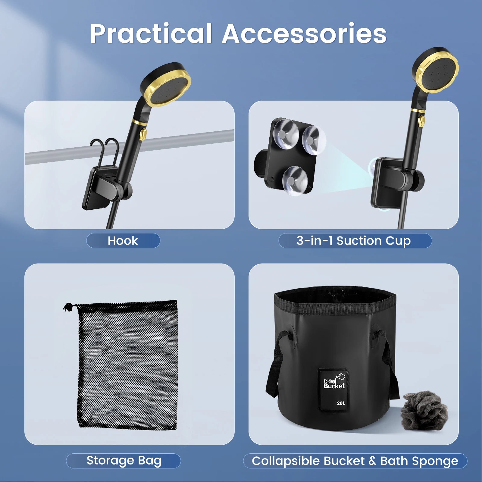 Pommeau de douche polyvalent et crochet 3 en 1 :Profitez d'une expérience de douche personnalisable avec cinq angles réglables.Le bouton de contrôle de débit en continu vous permet d'affiner le débit d'eau, tandis que le crochet 3 en 1 permet un montage facile sur les murs, les vitres de voiture ou les branches d'arbres, offrant un maximum de commodité où que vous soyez.