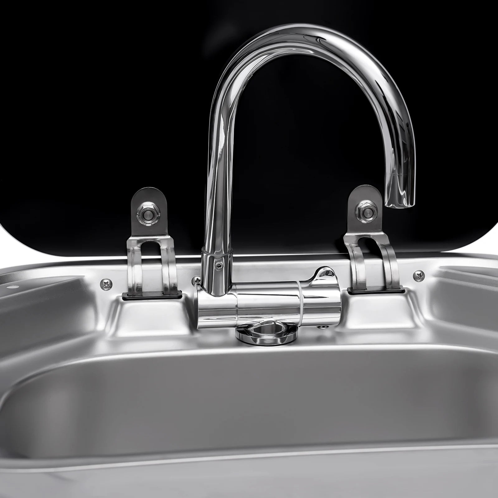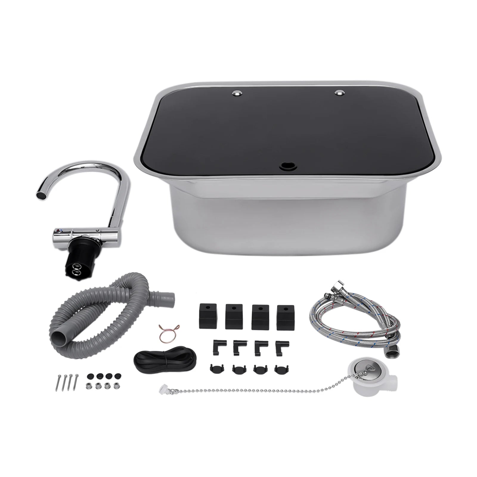 Apparence élégante : l'évier argenté est très brillant et exquis.Son couvercle noir est élégant et polyvalent.Et le design carré est soigné et simple.Cet évier avancé est donc très adapté à votre camping-car.